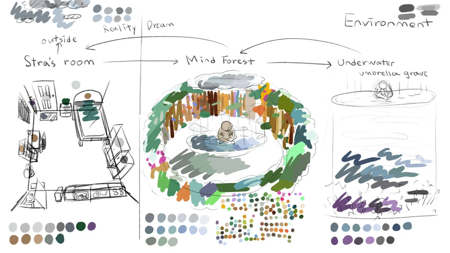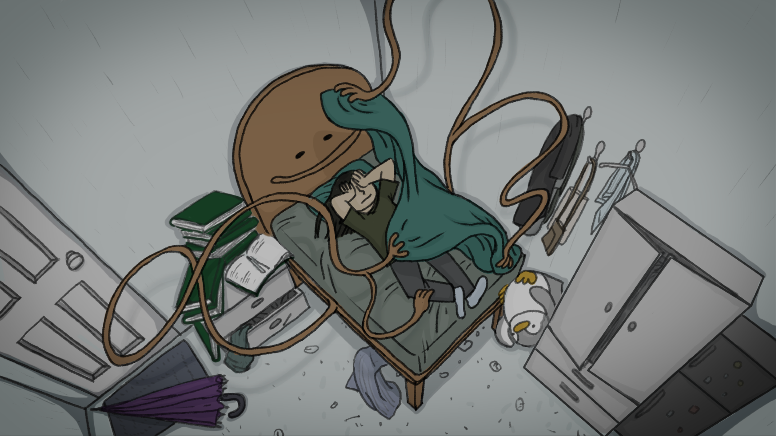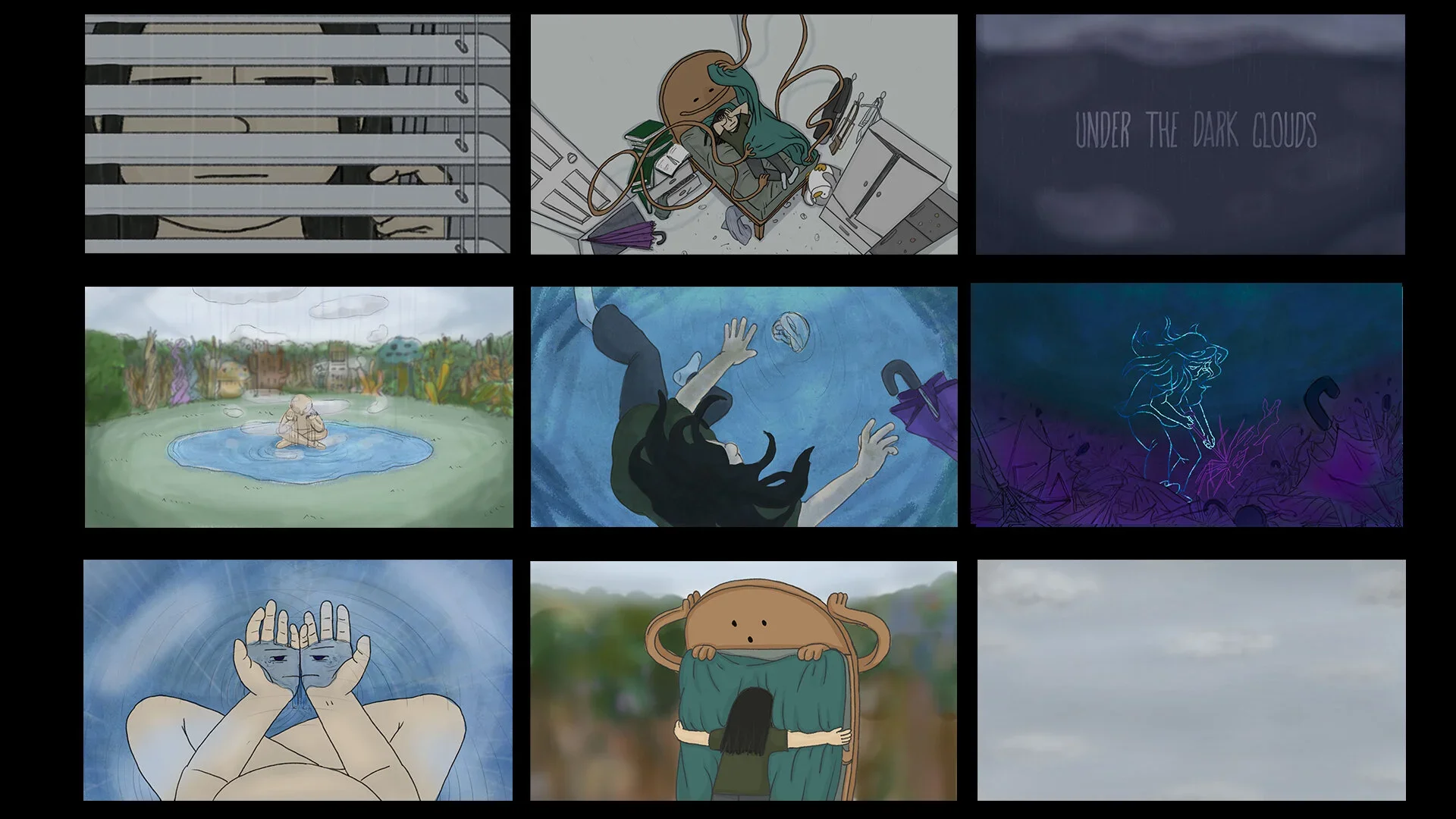 Under the Dark Clouds is a 2D mixed-media fantasy animation about visiting a dream world. Stra tends to sleep when she wants to escape from the reality. Her bed come alive and lets Stra enter a dream world, where she faces herself and accepts her depression. This film addresses the idea of self-acceptance, and how dreams reflect our unconsciousness.