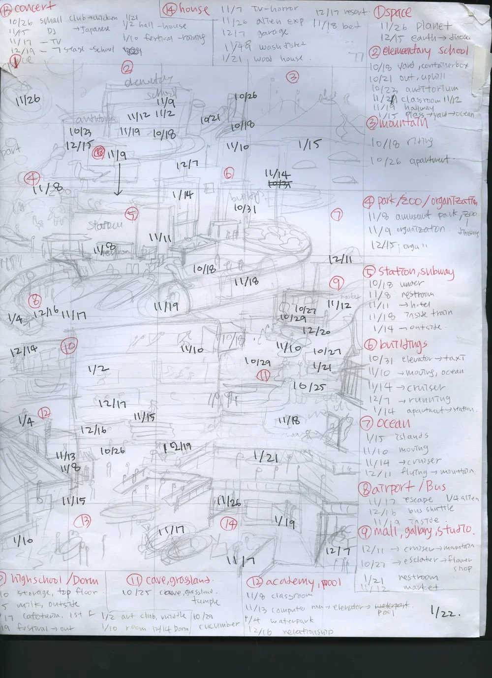 I make daily records of each dream by writing, drawing, or voice recording. This information is then categorized by date, place, and types of events that occur within the dream. These records are the blueprint determining the layout of my hybridized dream world. In order to accurately reflect the atmospheric quality of my dreams, I carefully consider the relationships between shape, color, lighting, and the function of each object and creature. For instance, I dreamt of going to a conveyor belt sushi restaurant in an amusement park which offered a psychological test. I realized conveyor belts and rollercoasters have a similar construction, so I drew a sushi belt that becomes a rollercoaster ride with sushi dish shaped seats. I composed sushi belt as a foreground and rollercoaster as a background, so the scale of the people taking sushi from the belt and the people going on a ride shifts substantially. As a result, eccentric constructions and perspective distortion are formed.